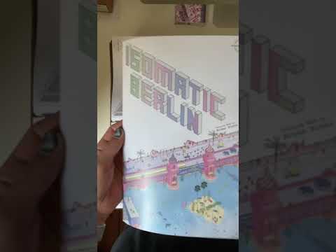 GIF showing how to cut apart Polar Embassy's Isomatic Berlin coloring book, and create one of the wall posters. Jon Derman Harris' hands cut the book with a mat knife, then tape 9 A4 pages together to create a wall poster, that he hangs on a wall at the end.